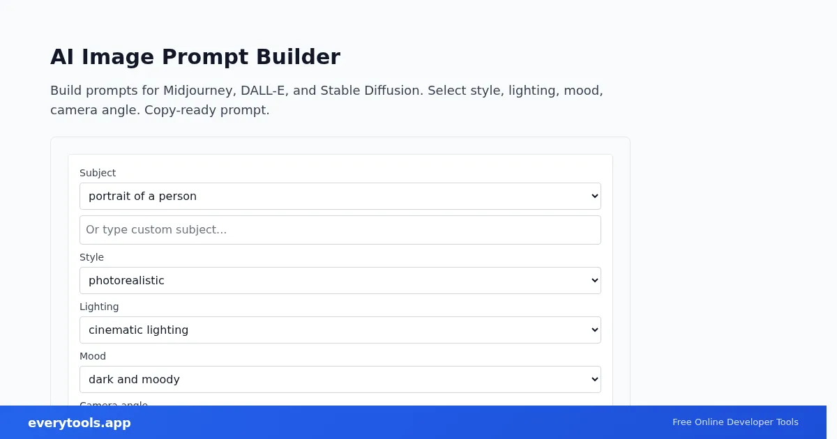 Build prompts for Midjourney, DALL-E, and Stable Diffusion. Select style, lighting, mood, camera angle. Copy-ready prompt.