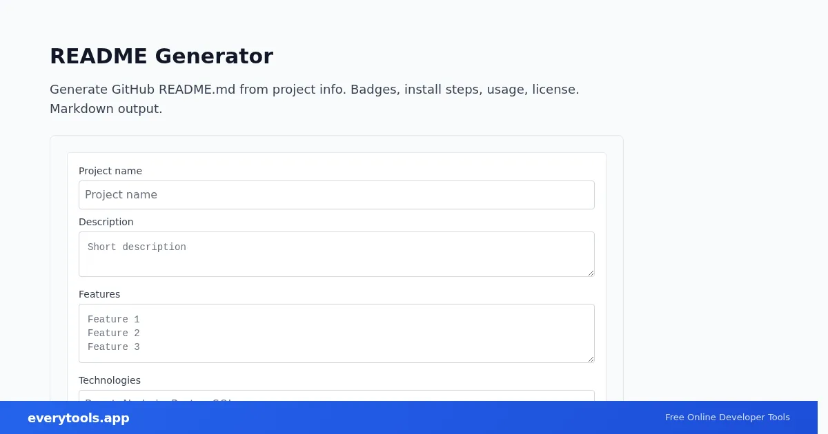 This free online readme generator runs in your browser. No installation, no signup. Paste your input above and get instant results. Works on desktop and mobile.